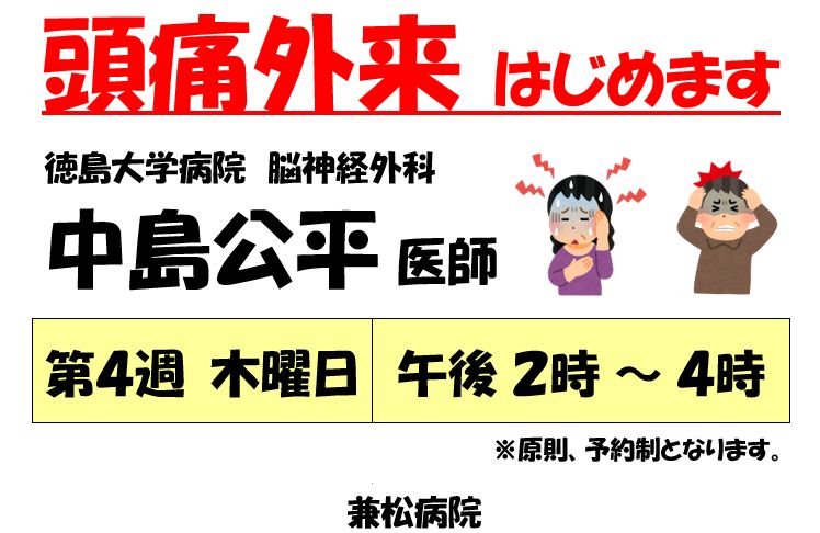 頭痛外来はじめます 4月より 2026 3/27 一般の方へ 2026年3月27日 一般の方へ スポーツ・健康外来 はじめます <令和8年4月より> 関連記事 スポーツ・健康外来 はじめます <令和8年4月より> 2026年3月23日 乳がん・甲状腺の特別講習会 4月 4日(土) 2026年3月10日 面会制限の変更について<2月16日(月)より> 2026年2月14日 健康教室 3月19日(木) 午後2時より 2026年2月1日 乳腺(乳がん)の手術を再開しました 2025年11月11日 居宅介護支援事業所休止について 2025年9月1日 <4月から> 診療時間が変わります 2025年3月1日 休日・夜間診療が変わります(鳴門市) 2024年12月27日