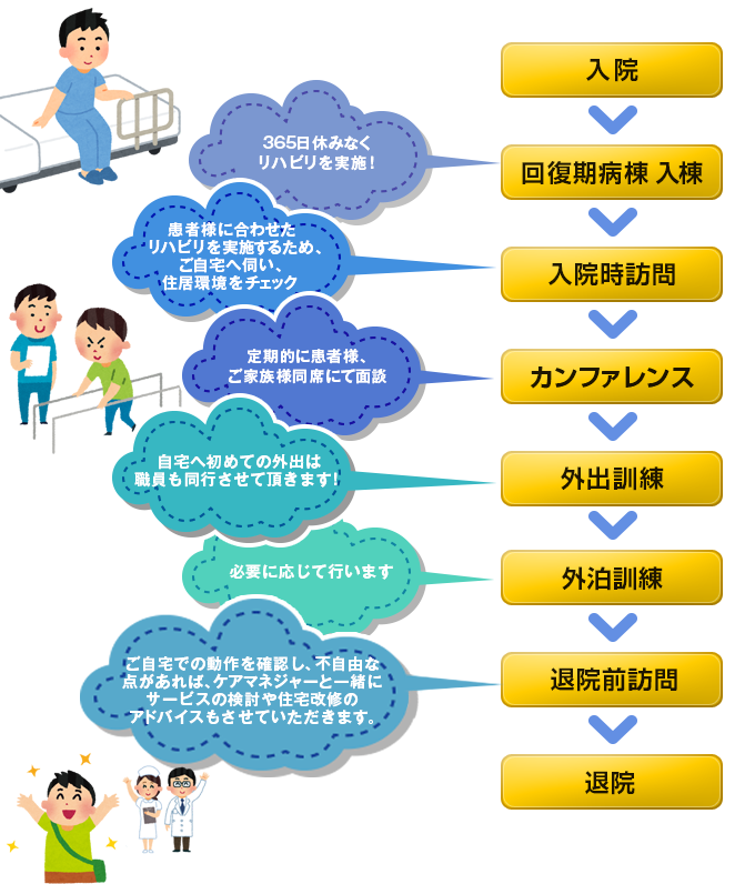 入院されてから早期に、ご自宅訪問をさせていただき、具体的な生活環境のイメージを持ち、それをもとにリハビリプログラムを立てて、退院後も快適に生活を送っていただけるように援助(住宅改修や福祉用具選択のアドバイス等)をさせていただきます。